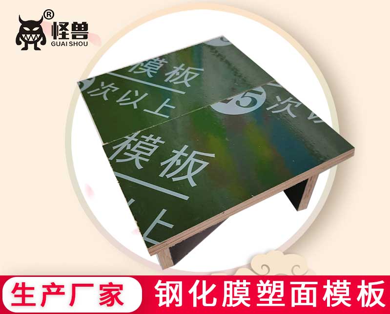 怪獸木業研發生產鋼化膜塑面模板,采用鋼化塑面模板技術生產的覆塑建筑模板、土豪金鋼化膜塑面建筑模板保用周轉33次。